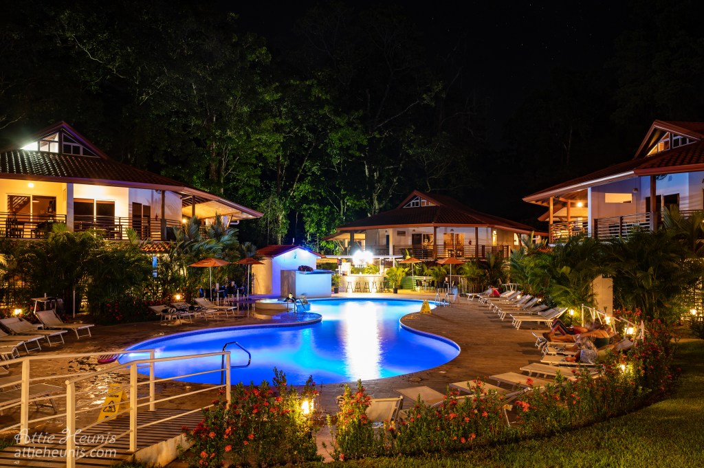 Terrazas del Caribe has a beautiful pool. We checked in to Terrazas del Caribe at around 6pm. It’s a few miles outside of Puerto Viejo just behind Playa Cocles. (“Playa” means “Beach” in Spanish) and a ~3-minute drive up a steep gravel road away from the main road. Check-in was very easy and our room was great and the pool even better. There is a decent kitchen and a superb patio as well.